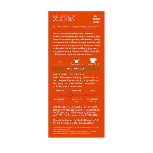 • Package contains 1 box of 10 Starbucks Single-Origin Colombia Nespresso Coffee Capsules to make up to 10 cups