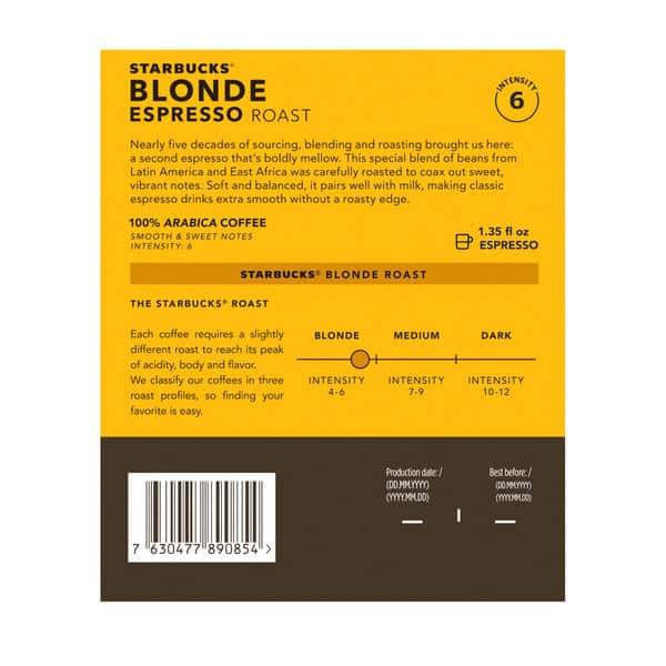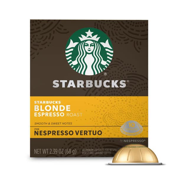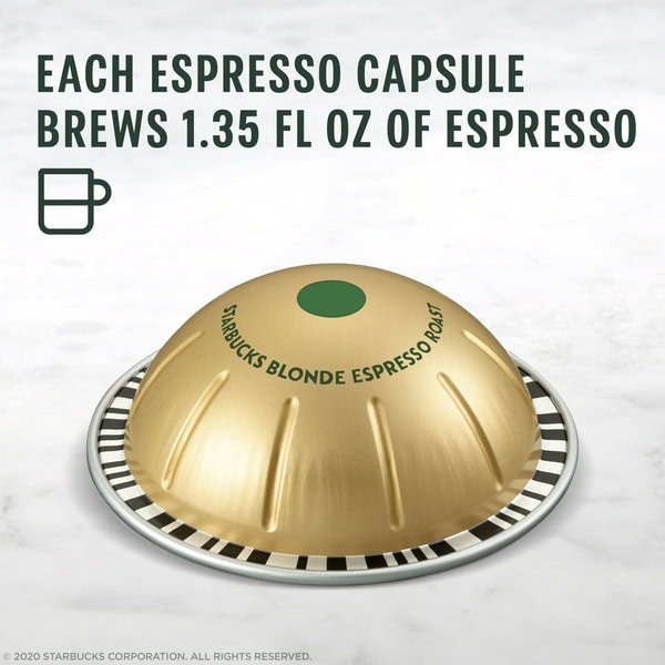 Enjoy the authentic café taste of Starbucks coffee at home like never before on Nespresso Vertuo machines. Made with the finest quality Starbucks coffee that you know and love, Starbucks capsules are developed with Nespresso to work perfectly with the Nespresso Vertuo system and are fully recyclable through the Nespresso recycling program. Each cup of Starbucks Blonde Espresso Roast coffee is smooth and sweet and made with 100% arabica coffee beans. Selected coffee bean requires a unique balance of temperature and time to reach its individual peak of aroma, acidity, body and flavor. Authentically delicious perfection is just a cup away. Nestlé uses Starbucks trademarks under license.​