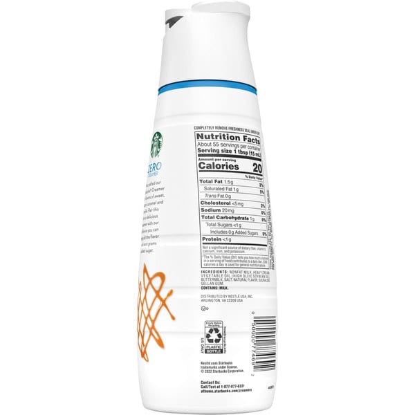Indulge in Starbucks Zero Grams Added Sugar Caramel Flavored Coffee Creamer. Exclusively designed for all coffee lovers, our caramel coffee creamer is inspired by the Iconic Starbucks Caramel Macchiato. This 28 fl oz Starbucks creamer is carefully crafted with layers of sweet buttery caramel and vanilla flavors. Each sip is a testament to our dedication to quality and flavor. Whether you’re enjoying a hot cup in the morning or an iced coffee during your afternoon break, this nonfat milk creamer pairs perfectly with our coffee for an oh-so-delicious cup every time. With this Starbucks creamer, you can bring the Starbucks experience right to your kitchen.