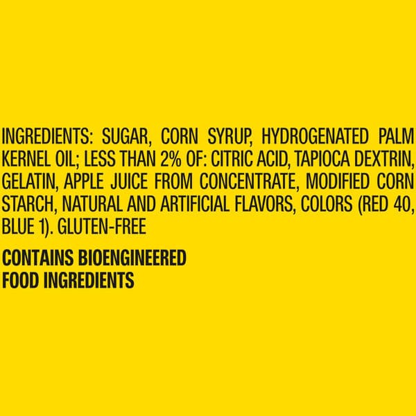 Sugar, Corn Syrup, Hydrogenated Palm Kernel Oil; Less Than 2% Of: Citric Acid, Tapioca Dextrin, Gelatin, Apple Juice From Concentrate, Modified Corn Starch, Natural And Artificial Flavors, Colors (red 40, Blue 1).