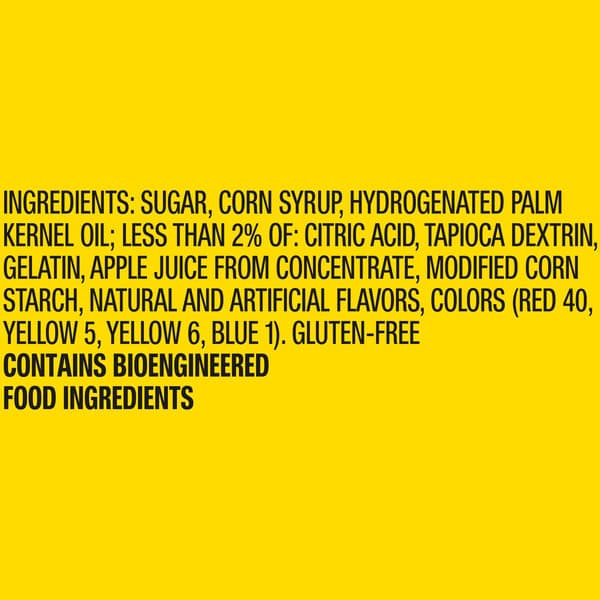 Sugar, Corn Syrup, Hydrogenated Palm Kernel Oil; Less Than 2% Of: Citric Acid, Tapioca Dextrin, Gelatin, Apple Juice From Concentrate, Modified Corn Starch, Natural And Artificial Flavors, Colors (red 40, Yellow 5, Yellow 6, Blue 1).