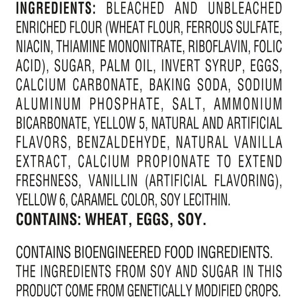 Enriched Flour (bleached And Unbleached Wheat Flour, Niacin, Reduced Iron, Thiamine Mononitrate, Riboflavin, Folic Acid), Sugar, Vegetable Oil (contains One Or More Of The Following: Canola Oil, Palm Oil, Soybean Oil), Whole Eggs, Egg Yolks, Invert Sugar, Leavening (baking Soda, Sodium Aluminum Phosphate, Ammonium Bicarbonate), Calcium Carbonate, Natural And Artificial Flavors, Salt, Artificial Colors (yellow 5, Yellow 6), Calcium Propionate (preservative), Soy Lecithin.