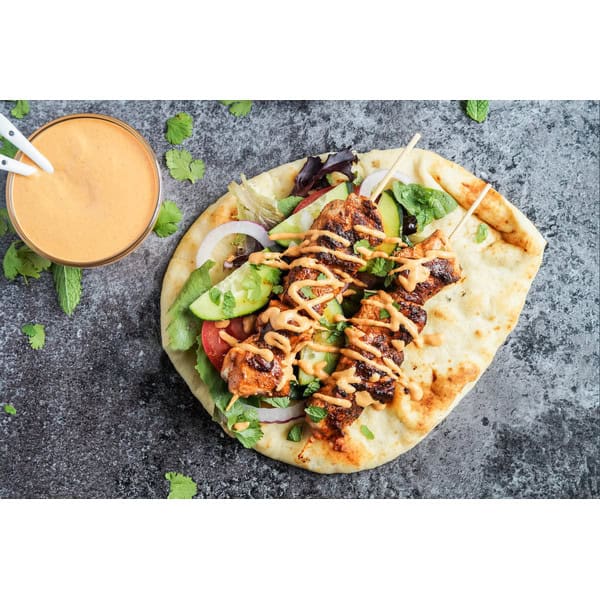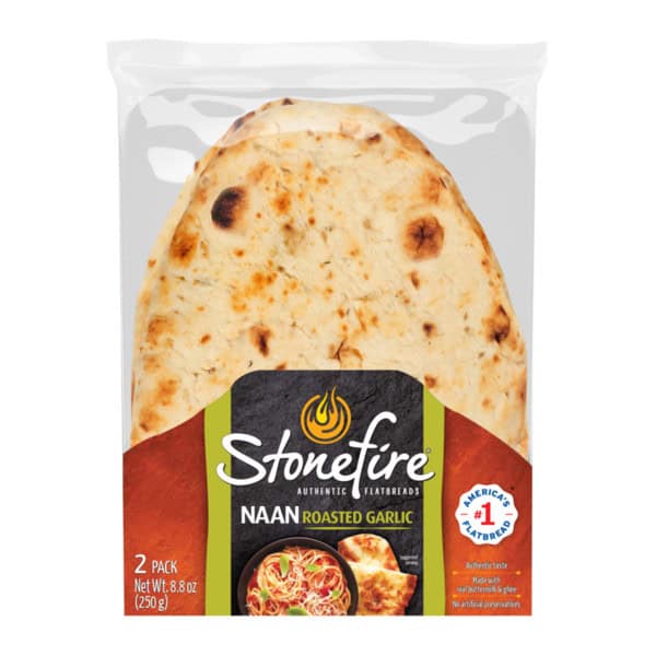 Perfect for meals that need a savory companion. An excellent substitution garlic bread or create a delicious pizza with your favorite toppings. Soft, fluffy and delicious! Stonefire® Roasted Garlic Naan bread is our classic, delicious fire-roasted garlic table bread with a hint of cilantro. We stay true to an ancient recipe by using fresh buttermilk & ghee (clarified butter) and hand-stretching each naan into its unique teardrop shape. Then each Stonefire® naan is baked in our high heat patented tandoor tunnel oven to create our signature bubbles & char and an amazing texture and taste you notice on first bite. Just heat and serve to make any meal special.