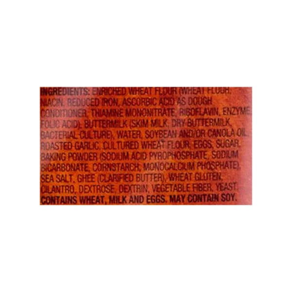Enriched Wheat Flour (wheat Flour, Niacin, Reduced Iron, Ascorbic Acid Added As Dough Conditioner, Thiamine Mononitrate, Riboflavin, Enzyme, Folic Acid), Buttermilk (nonfat Milk, Dry Buttermilk, Bacterial Culture), Water, Soybean Oil, Roasted Garlic, Cultured Wheat Flour, Eggs, Sugar, Baking Powder (sodium Acid Pyrophosphate, Baking Soda, Cornstarch, Monocalcium Phosphate), Sea Salt, Ghee (clarified Butter), Wheat Gluten, Cilantro, Dextrose, Dextrin, Carrot Aber, Yeast