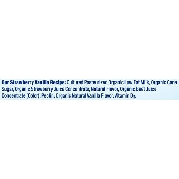 Cultured Pasteurized Organic Low Fat Milk, Organic Sugar, Organic Sugar, Organic Strawberry Juice From Concentrate, Natural Flavors, Organic Beet Juice Concentrate (for Color), Pectin, Organic Natural Vanilla Flavor, Vitamin D3. Contains Six Live Active Cultures: S. Thermophilus, L. Bulgaricus, L. Acidophilus, Bifidus, L. Casei And L. Rhamnosus.