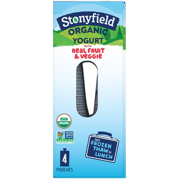 Hungry kids are no picnic. Fix it quick with portable Stonyfield Organic Whole Milk Yogurt Pouches for kids! Make morning yummy with an energy-boosting infusion of protein that’s sure to help get your kids out of bed and into the kitchen for breakfast. Or pack a right-size yogurt pouch for lunch, sports, camping, or on the go. We use 100% Grade A milk from pasture-raised cows, live and active cultures, and a variety of flavors made with real fruit and veggie to create a tantalizing snack for kids on the go. Our yogurt is made without the use of toxic persistent pesticides, antibiotics, artificial growth hormones, or genetically modified organisms (GMOs), protecting growing kids for the long haul and contributing to a healthy and sustainable world. Try our full line of products for babies and kids, including yogurt cups, yogurt pouches, multi-serving yogurt containers, dairy free smoothie pouches, drinkable yogurt, yogurt tubes and more. With fresh taste, high-quality ingredients, and no added nonsense, Stonyfield Organic Yogurt for kids is #goodonpurpose!,