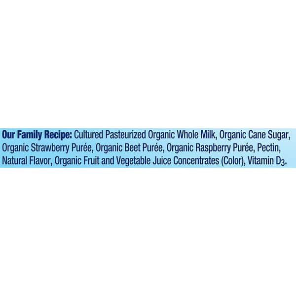 Our Family Recipe: Cultured Pasteurized Organic Whole Milk, Organic Cane Sugar, Organic Strawberry Puree, Organic Beet Puree, Organic Raspberry Puree, Pectin, Natural Flavor, Organic Fruit And Vegetable Juice Concentrates (color), Vitamin D3.