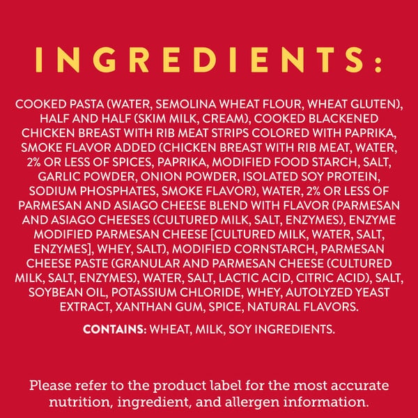 Cooked Pasta (water, Semolina Wheat Flour, Wheat Gluten), Half And Half (skim Milk, Cream), Cooked Blackened Chicken Breast With Rib Meat Strips Colored With Paprika, Smoke Flavor Added (chicken Breast With Rib Meat, Water, 2% Or Less Of Spices, Paprika, Modified Food Starch, Salt, Garlic Powder, Onion Powder, Isolated Soy Protein, Sodium Phosphates, Smoke Flavor), Water, 2% Or Less Of Parmesan And Asiago Cheese Blend With Flavor (parmesan And Asiago Cheeses (cultured Milk, Salt, Enzymes), Enzyme Modified Parmesan Cheese (cultured Milk, Water, Salt, Enzymes), Whey, Salt), Modified Cornstarch, Parmesan Cheese Paste (granular And Parmesan Cheese [cultured Milk, Salt, Enzymes], Water, Salt, Lactic Acid, Citric Acid), Salt, Soybean Oil, Potassium Chloride, Whey, Autolyzed Yeast Extract, Xanthan Gum, Spice, Natural Flavors