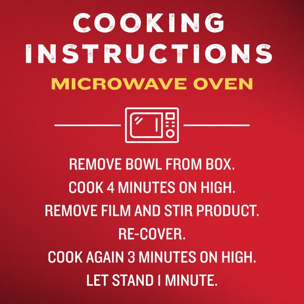 For food safety and quality, follow these cooking instructions. Microwave Oven Only (100 Watts): Remove bowl from box. Cook 4:00 minutes on high. Remove film and stir product re-cover. Cook again 3:00 minutes on high. Let stand 1 minute. Will be hot! Directions developed using 1100 watt microwave oven. Ovens vary; cooking time may need adjusting. Ensure product reaches an internal temperature of 165 degrees F. Do not prepare in conventional or toaster ovens. Do not reheat bowl.