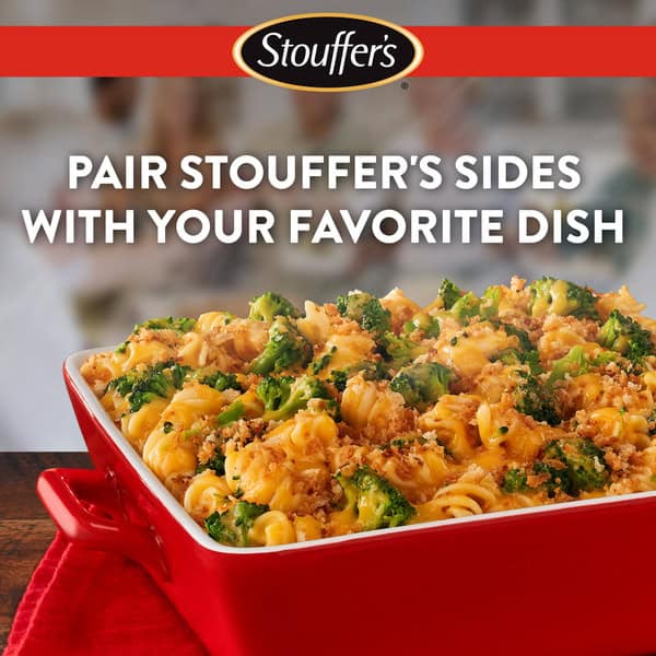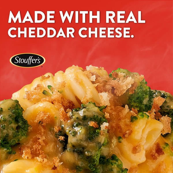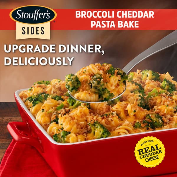 • Stouffer’s broccoli and cheddar frozen side dish features broccoli and rotini pasta in a real cheddar cheese sauce, topped with breadcrumbs