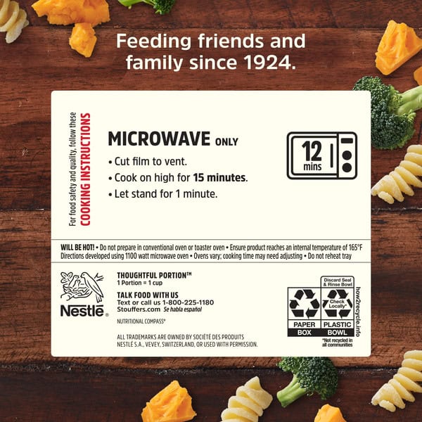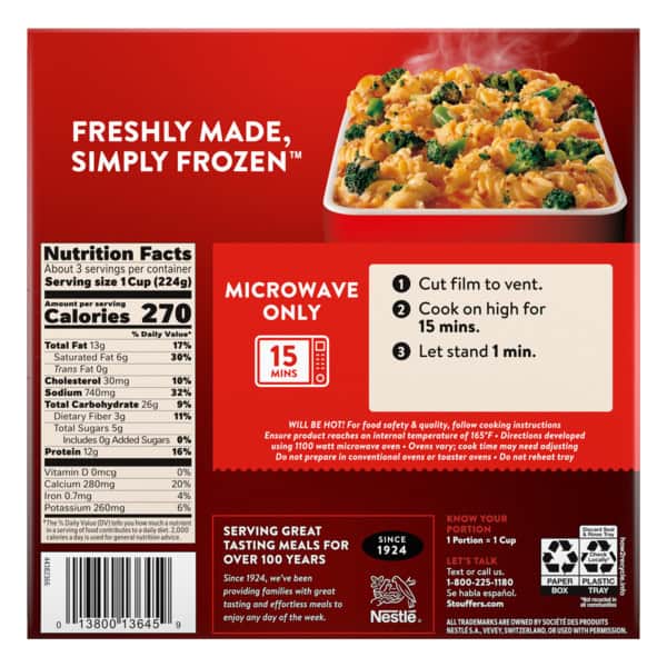 Stouffer’s Broccoli Cheddar Pasta Bake Frozen Side offers a quick, easy solution for lunch or dinner. This Stouffer’s frozen side dish features broccoli and rotini pasta in a real cheddar cheese sauce, topped with breadcrumbs for the perfect complement to family dinners. Made with real cheddar cheese, this ready to bake Stouffers frozen side dish is sure to satisfy every taste bud. Each serving of this frozen food quick dinner offers 12 grams of protein per serving. Stouffer’s frozen pasta entrees and sides continue a tradition of delicious food with quality ingredients and the homemade flavor you love. These Family Size frozen side dishes are easy to prepare in the microwave or oven, making this frozen broccoli and cheese bake ideal to serve as a side for a quick dinner when you’re short on time. Keep Stouffer’s Broccoli Cheddar Pasta in the freezer until you’re ready to enjoy.