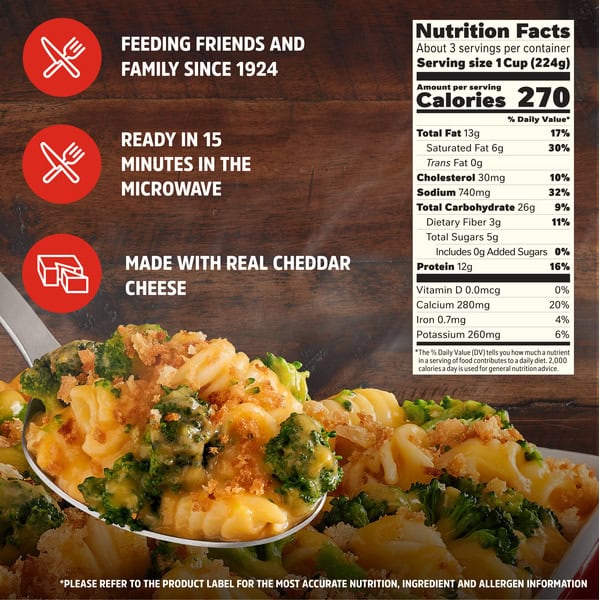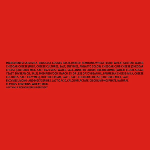 Skim Milk, Broccoli, Cooked Pasta (water, Semolina Wheat Flour, Wheat Gluten), Water, Cheddar Cheese (milk, Cheese Cultures, Salt, Enzymes, Annatto Color), Cheddar Club Cheese (cheddar Cheese [cultured Milk, Salt, Enzymes], Water, Salt, Annatto Color), Breadcrumbs (wheat Flour, Sugar, Yeast, Soybean Oil, Salt), Modified Cornstarch, 2% Or Less Of Soybean Oil, Parmesan Cheese (milk, Cheese Cultures, Salt, Enzymes), Butter (cream, Salt), Salt, Cheddar Cheese (cultured Milk, Salt, Enzymes), Mono- And Diglycerides, Lactic Acid Blend (lactic Acid, Calcium Lactate), Disodium Phosphate, Natural Flavors.