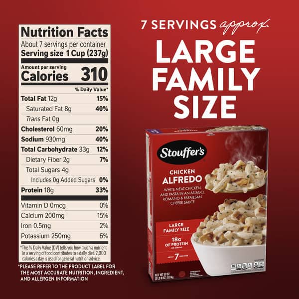 • LARGE FAMILY SIZE PORTION: With about 7 servings of Stouffer’s large family size chicken alfredo, you can easily keep the whole family happy and satisfied. Take boring and bland foods off the dinner table