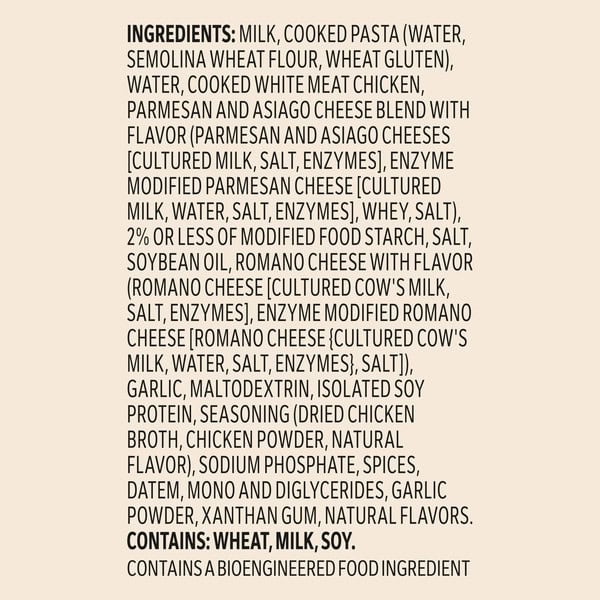 Milk, Cooked Pasta (water, Semolina Wheat Flour, Wheat Gluten), Water, Cooked White Meat Chicken, Parmesan And Asiago Cheese Blend With Flavor (parmesan And Asiago Cheeses [cultured Milk, Salt, Enzymes], Enzyme Modified Parmesan Cheese [cultured Milk, Water, Salt, Enzymes], Whey, Salt), 2% Or Less Of Modified Cornstarch, Salt, Romano Cheese With Flavor (romano Cheese [cultured Cow’s Milk, Salt, Enzymes], Enzyme Modified Romano Cheese [romano Cheese (cultured Cow’s Milk, Water, Salt, Enzymes), Salt]), Garlic, Maltodextrin, Datem, Isolated Soy Protein, Seasoning (dried Chicken Broth, Chicken Powder, Natural Flavor), Sodium Phosphate, Spices, Garlic Powder, Xanthan Gum, Flavor