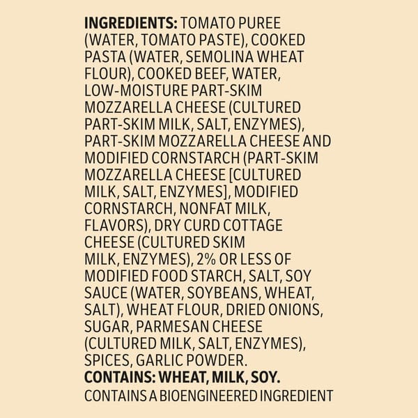 Sauce: Tomato Puree (water, Tomato Paste), Cooked Beef, Water, Dry Curd Cottage Cheese (cultured Skim Milk, Enzymes), Modified Cornstarch, Sea Salt, Soy Sauce (water, Wheat, Soybeans, Salt), Wheat Flour, Dried Onions, Sugar, Spices, Garlic Powder. Cooked Pasta: Water, Semolina. Cheese: Low-moisture Part-skim Mozzarella Cheese (cultured Part-skim Milk, Salt, Enzymes), Part-skim Mozzarella Cheese And Modified Cornstarch (part-skim Mozzarella Cheese [cultured Milk, Salt, Enzymes], Modified Cornstarch, Nonfat Milk, Flavors), Parmesan Cheese (cultured Milk, Salt, Enzymes).