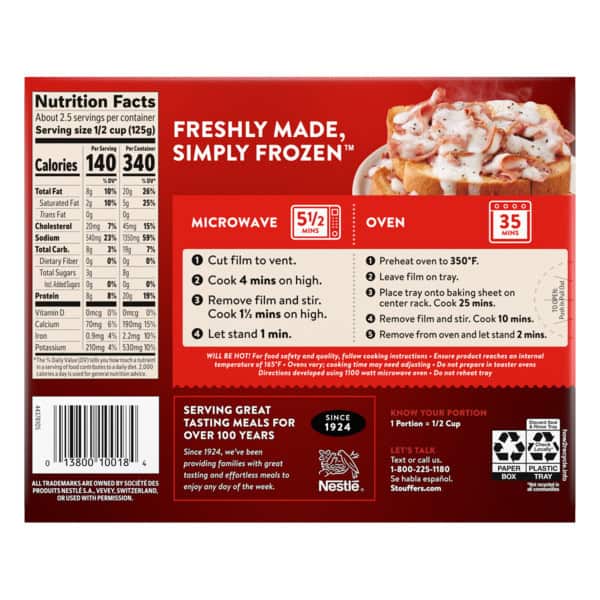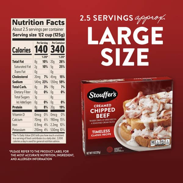 • FRESHLY MADE, SIMPLY FROZEN: With a Stouffer’s frozen dinner in your freezer, you’ll always be ready to enjoy something delicious. Keep the chipped beef in your freezer until you’re ready to cook and serve