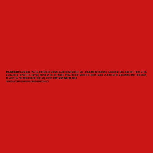 Skim Milk, Water, Chipped Beef Chunked And Formed (cured With Salt, Sodium Erythorbate, Sodium Nitrite, Bht, Tbhq, Citric Acid), Soybean Oil, Bleached Wheat Flour, 2% Or Less Of Modified Cornstarch, Seasoning (maltodextrin, Flavor, Enzyme Modified Butterfat), Seasoning (wheat Starch, Extractives Of Annatto And Turmeric, Bha, Bht), Spice.