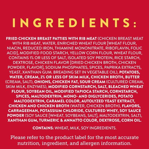 Fried Chicken Breast Patties With Rib Meat (chicken Breast Meat With Rib Meat, Water, Enriched Wheat Flour [wheat Flour, Niacin, Reduced Iron, Thiamine Mononitrate, Riboflavin, Folic Acid], Modified Food Starch, Yellow Corn Flour, Wheat Flour, Contains 1% Or Less Of Salt, Isolated Soy Protein, Rice Starch, Dextrose, Chicken Flavor [dried Chicken Broth, Chicken Powder, Flavor], Sodium Phosphates, Spices, Paprika Extracts, Yeast, Xanthan Gum. Breading Set In Vegetable Oil), Potatoes, Water, Cream, 2% Or Less Of Skim Milk, Chicken Broth, Butter (cream, Salt), Onions, Chicken Fat, Sour Cream (cultured Cream, Skim Milk, Enzymes), Modified Cornstarch, Salt, Bleached Wheat Flour, Soybean Oil, Modified Tapioca Starch, Spices, Mono- And Diglycerides, Potato Maltodextrin, Seasoning (maltodextrin, Flavor, Enzyme Modified Butterfat), Maltodextrin, Caramel Color, Chicken And Chicken Broth (water, Chicken Broth), Autolyzed Yeast Extract, Carrageenan, Potassium Chloride, Cultured Whey, Dried Garlic, Onion Powder, Natural Flavors, Dried Soy Sauce (soybeans, Wheat, Salt), Xanthan Gum, Turmeric & Annatto Color, Flavors, Dextrose