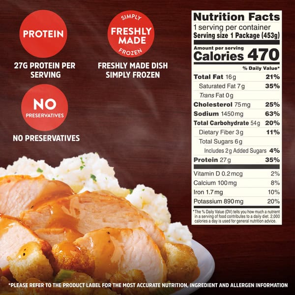 • Frozen entree includes turkey medallions and stuffing in a homestyle gravy with russet mashed potatoes