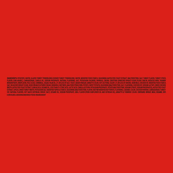 Potatoes, Water, Glazed Turkey Tenderloins (cooked Turkey Tenderloins, Water, Modified Food Starch, Seasoning [autolyzed Yeast Extract, Maltodextrin, Salt, Turkey Flavor, Turkey Stock, Flavor, Gum Arabic], Carrageenan, Canola Oil, Sodium Phosphate, Natural Flavoring, Salt, Potassium Chloride, Paprika), Cream, Croutons (enriched Wheat Flour [flour, Niacin, Reduced Iron, Thiamin Mononitrate, Riboflavin, Folic Acid], Cornmeal, Sugar, Palm Oil, 2% Or Less Of Salt, Yeast, Grain Vinegar, Annatto Color, Soy Lecithin], Celery, 2% Or Less Of Onions, Skim Milk, Chicken Fat, Modified Food Starch, Salt, Bleached Wheat Flour, Sour Cream (cultured Cream, Skim Milk, Enzymes), Maltodextrin (corn, Potato, Sweet Potato), Seasoning (maltodextrin, Salt, Flavoring, Chicken Fat, Sodium Lactate, Dried Chicken Broth, Autolyzed Yeast Extract, Gum Acacia, Sesame Oil, Less Than 2% Citric Acid, Lactic Acid, Canola Lecithin, Potassium Phosphate, Potato Maltodextrin, Sodium Citrate, Sodium Phosphates), Autolyzed Yeast Extract, Spices, Dried Turkey Broth, Potassium Salt, Modified Tapioca Starch, Seasoning (maltodextrin, Flavor, Enzyme Modified Butterfat), Flavoring, Caramel Color, Chicken Powder, Carrageenan, Turkey Fat, Natural Flavors, Soy Sauce (soybean, Wheat, Salt), Sesame Oil, Sodium Phosphate, Grill Flavor (from Sunflower Oil And Soybean Oil), Annatto & Turmeric Color.