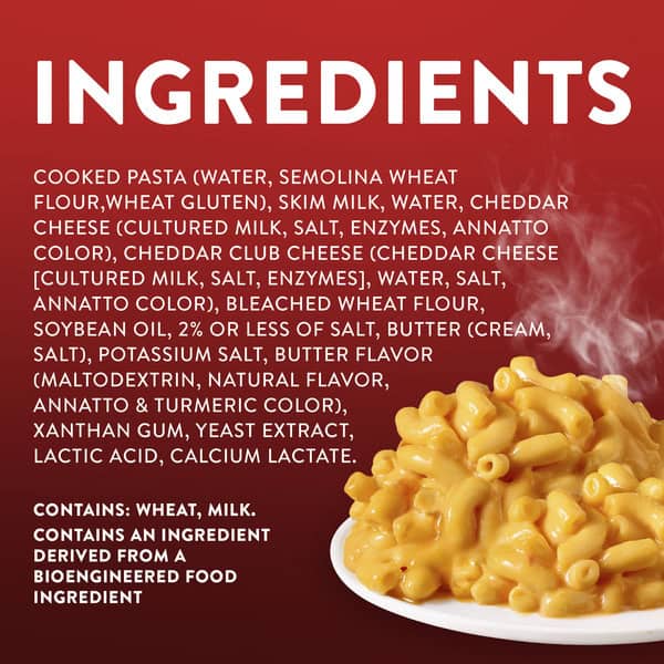Cooked Pasta (water, Semolina Wheat Flour,wheat Gluten), Skim Milk, Water, Cheddar Cheese (cultured Milk, Salt, Enzymes, Annatto Color), Cheddar Club Cheese (cheddar Cheese [cultured Milk, Salt, Enzymes], Water, Salt, Annatto Color), Bleached Wheat Flour, Soybean Oil, 2% Or Less Of Salt, Butter (cream, Salt), Potassium Salt, Butter Flavor (maltodextrin, Natural Flavor, Annatto & Turmeric Color), Xanthan Gum, Yeast Extract, Lactic Acid, Calcium Lactate.