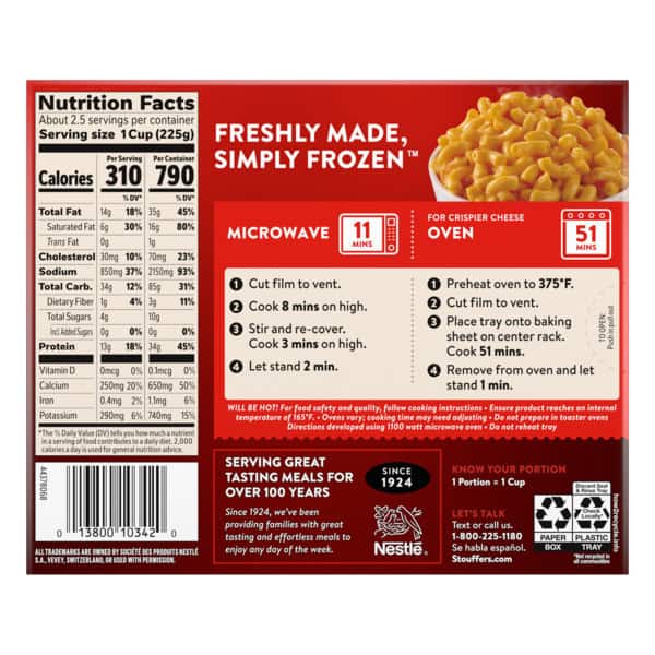 • FRESHLY MADE, SIMPLY FROZEN: With Stouffer’s frozen dinners in your freezer, you’ll always be ready to serve up something delicious — no additional ingredients required. Keep this mac n cheese frozen until you’re ready to cook and serve