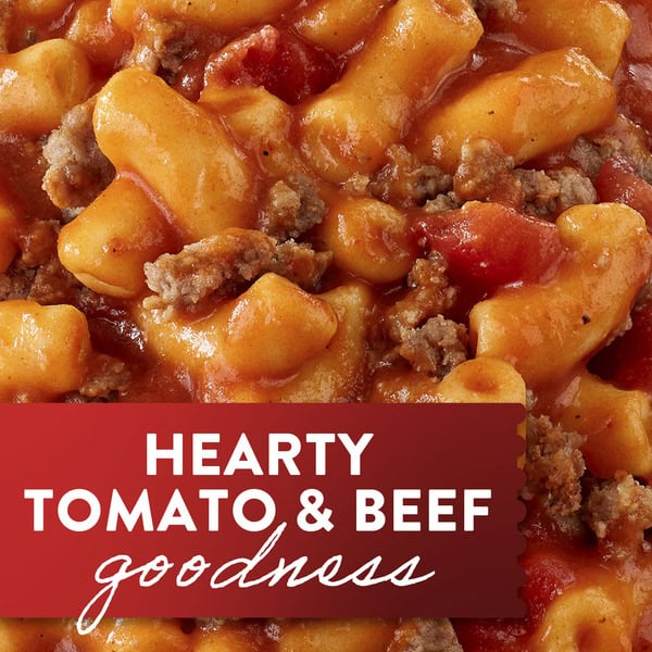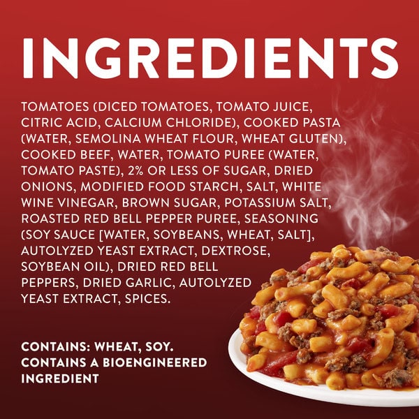 Tomatoes (diced Tomatoes, Tomato Juice, Citric Acid, Calcium Chloride), Cooked Pasta (water, Semolina Wheat Flour, Wheat Gluten), Cooked Beef, Water, Tomato Puree (water, Tomato Paste), 2% Or Less Of Sugar, Dried Onions, Modified Food Starch, Salt, White Wine Vinegar, Brown Sugar, Potassium Salt, Roasted Red Bell Pepper Puree, Seasoning (soy Sauce [water, Soybeans, Wheat, Salt], Autolyzed Yeastextract, Dextrose, Soybean Oil), Dried Red Bell Peppers, Dried Garlic, Autolyzed Yeast Extract, Spices.