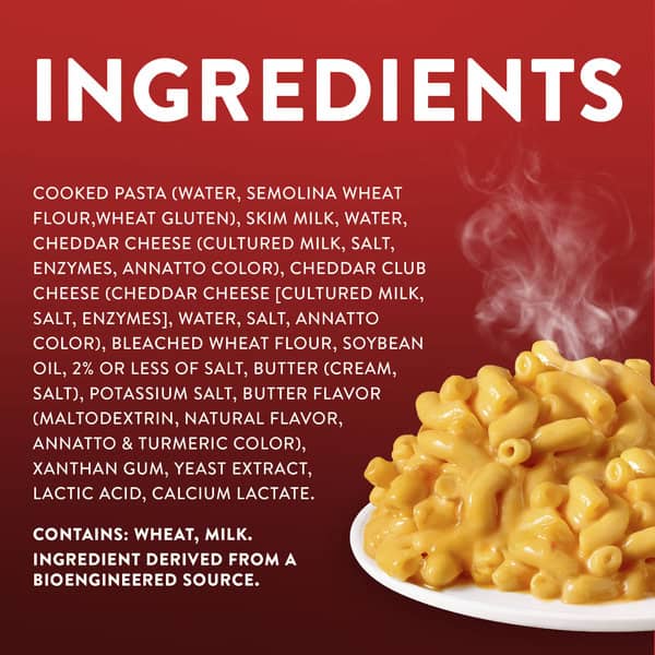 Cooked Pasta [water, Semolina Wheat Flour, Wheat Gluten), Skim Milk, Water, Cheddar Cheese Icultured Milk, Salt, Enzymes, Annatto Colori Cheddar Club Cheese (cheddar Cheese [cultured Milk, Salt, Enzymes], Water, Salt, Annatto Colori Bleached Wheat Flour, Soybean Oil, 2% Or Less Of Salt, Butter Icream, Salt), Potassium Salt, Butter Flavor (maltodextrin, Natural Flavor, Annatto & Turmeric Colori, Xanthan Gum, Yeast Extract, Lactic Acid, Calcium Lactate.