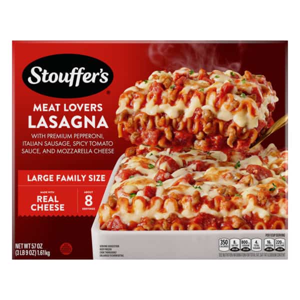 • CRAFTED WITH QUALITY YOU CAN TASTE: Stouffer’s frozen dinners are thoughtfully crafted with flavorful, quality ingredients. Our meat lovers lasagna is made with premium pepperoni, Italian sausage, spicy tomato sauce, and real mozzarella cheese