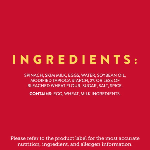 Spinach, Skim Milk, Eggs, Water, Soybean Oil, Modified Food Starch, 2% Or Less Of Bleached Wheat Flour, Sugar, Salt, Spice.
