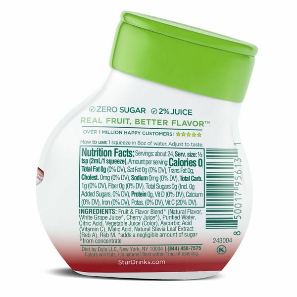 Fruit & Flavor Blend (natural Flavor, White Grape Juice^, Cherry Juice^), Purified Water, Citric Acid, Vegetable Juice (color), Ascorbic Acid (vitamin C), Malic Acid, Natural Stevia Leaf Extract (reb A), Reb M