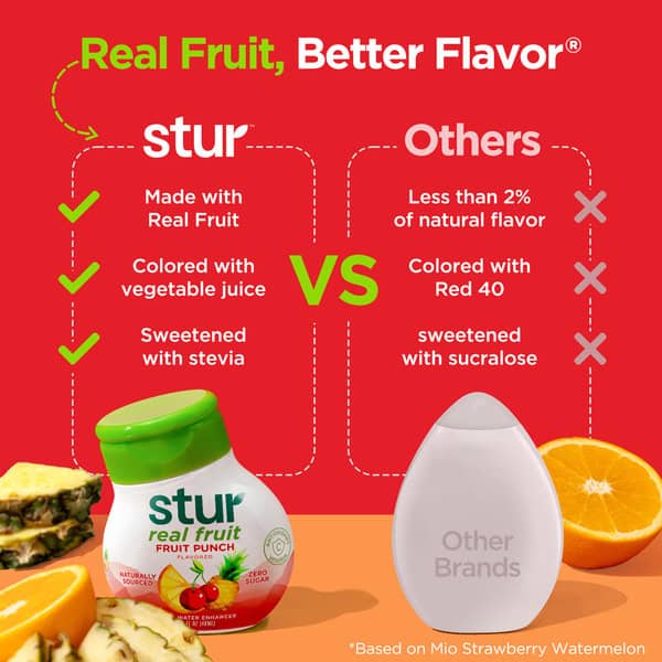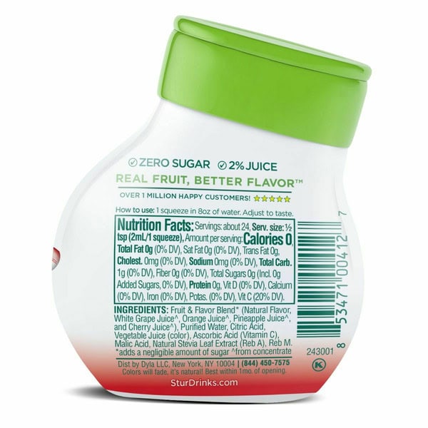 Available in a variety of delicious fruit flavors, Stur water enhancers are the liquid drink mix for consumers looking for natural ingredients. Delicious, naturally flavored water can now be made at home or on the go with our portable liquid drink mix bottles. To use, flip-open the cap. Point downwards directly into your water. And squeeze 1 second per serving in 8-ounces of water (squeeze longer to add more flavor)! Each portable bottle of Stur makes 20 8-ounce drinks – with 0 sugar, 0 calories, and an excellent source of Vitamin C per serving.