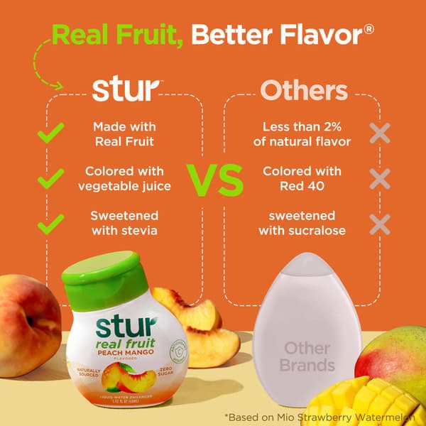 Available in a variety of delicious fruit flavors, Stur water enhancers are the liquid drink mix for consumers looking for natural ingredients. Delicious, naturally flavored water can now be made at home or on the go with our portable liquid drink mix bottles. To use, flip-open the cap. Point downwards directly into your water. And squeeze 1 second per serving in 8-ounces of water (squeeze longer to add more flavor)! Each portable bottle of Stur makes 20 8-ounce drinks – with 0 sugar, 0 calories, and an excellent source of Vitamin C per serving.