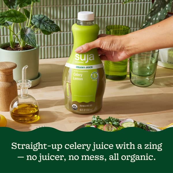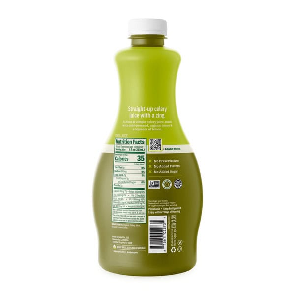 Suja Organic Cold Pressed Celery Juice is straight-up celery juice with a zing of lemon — no juicer and no mess required. With 5 servings of fruits and vegetables per 46 fl oz bottle, this Suja juice is an easy way to drink your greens. Every drop is 100% organic cold pressed juice from celery and a hint of lemon with no added sugar. This green juice is an excellent source of potassium and vitamins B6, C and K. Clean and simple, this organic juice is made with organic celery juice and a squeeze of organic lemon juice for a little something extra. Make every sip count with Suja Organic Cold Pressed Celery Juice to give your body a nutrient boost with breakfast, at school, while traveling or post-workout. Suja Organic juice is vegan, gluten free and non-GMO. Getting your greens feels good. And with Suja, you’re getting your vegetables.