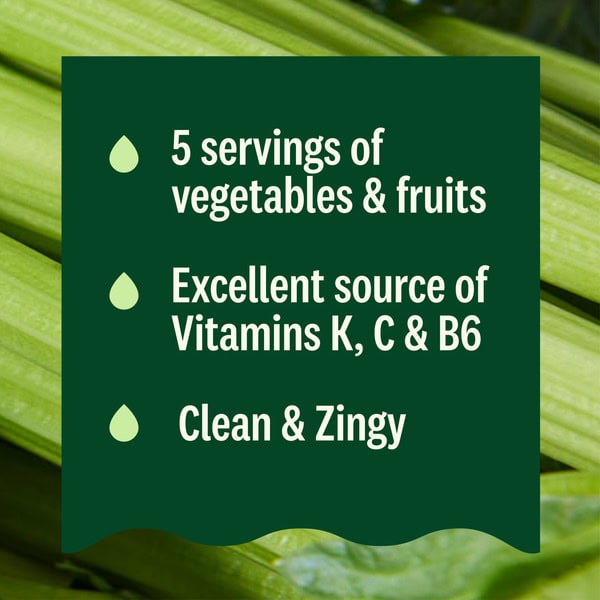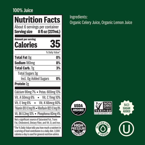 100% COLD PRESSED JUICE: Made with 100% organic juice from celery and lemon, this green juice is an excellent source of potassium and vitamins B6, C and K
