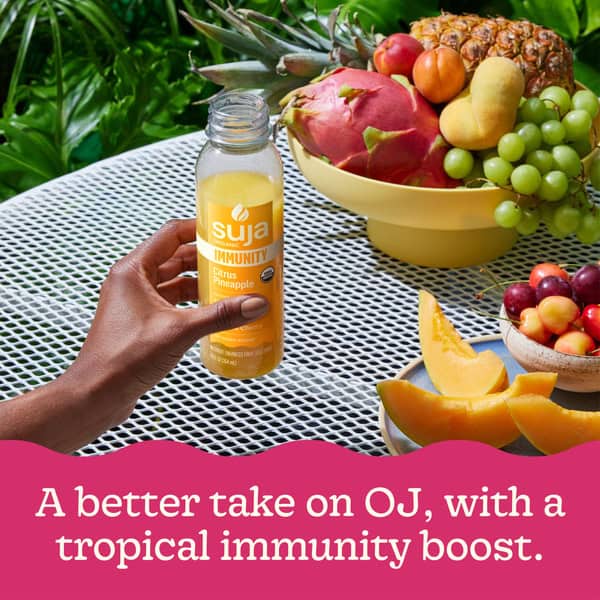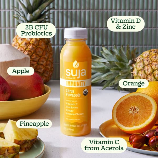 Suja Organic Immunity Citrus Pineapple Cold Pressed Juice is a better take on orange juice, with a tropical immunity boost. Seize the day with this Suja juice, a powerful blend of organic orange juice, pineapple juice, mango puree, coconut water, ginger juice and lemon juice. Rich in functional ingredients, this 12 fl oz organic juice drink is an excellent source of vitamin C, vitamin D and zinc, plus it arms you with live probiotics for immune support to keep you going strong. Enjoy Suja Organic Immunity Citrus Pineapple juice every morning as a delicious way to boost your immunity. Suja Organic juice is vegan, gluten free and non-GMO. Replace your morning OJ with a glass of Suja Organic Immunity Citrus Pineapple juice—the perfect way to seize the day.