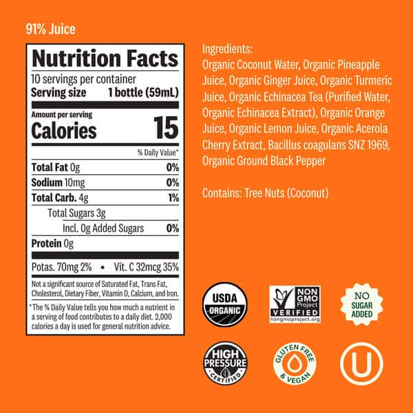 Organic Coconut Water, Organic Pineapple Juice, Organic Ginger Juice, Organic Turmeric Juice, Organic Echinacea Tea (purified Water, Organic Echinacea Extract), Organic Orange Juice, Organic Lemon Juice, Organic Acerola Cherry Extract, Bacillus Coagulans Snz 1969, Organic Ground Black Pepper