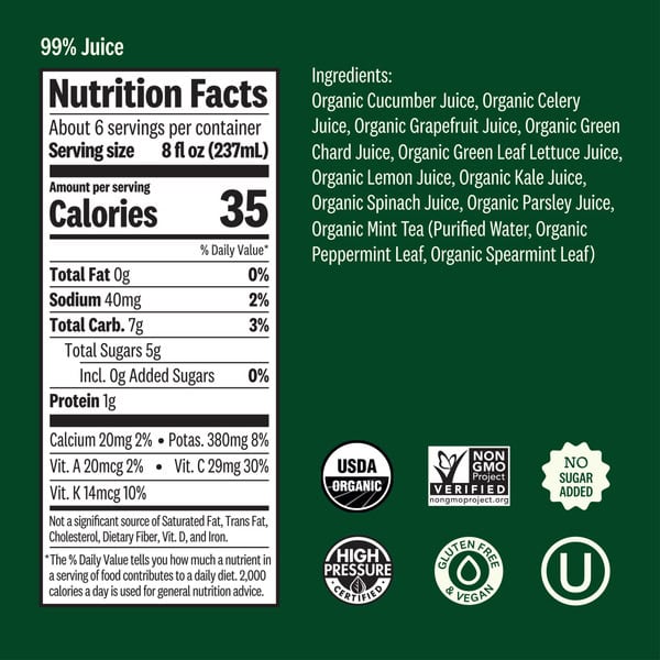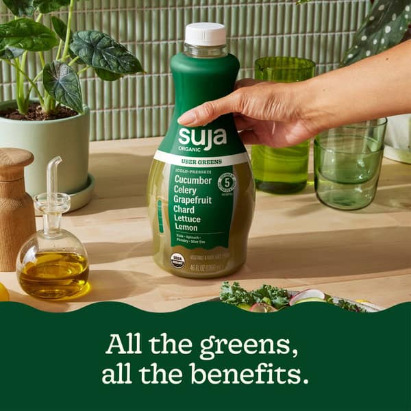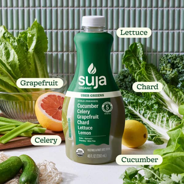 Suja Organic Uber Greens is a nutrient-dense cold pressed juice drink featuring bold, earthy greens with a light citrus tang. This Suja green juice is a delicious way to drink your vegetables and gulp your greens. This organic green juice has 5 servings of fruits and vegetables per 46 fl oz bottle and contains no added sugar. This green juice is an excellent source of potassium, vitamin C and vitamin K. Leafy greens like kale, spinach and lettuce are balanced with grapefruit, lemon and refreshing mint tea to give this organic juice an earthy, bold tang and optimal taste. Make every sip count with Suja Organic Uber Greens to give your body a nutrient boost with breakfast, at school, while traveling or post-workout. Suja Organic juice is vegan, gluten free and non-GMO. Getting your greens feels good. And with Suja, you’re getting your greens.