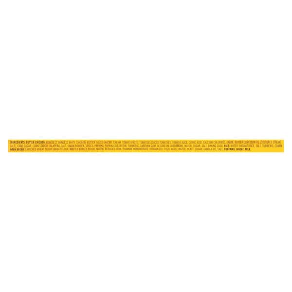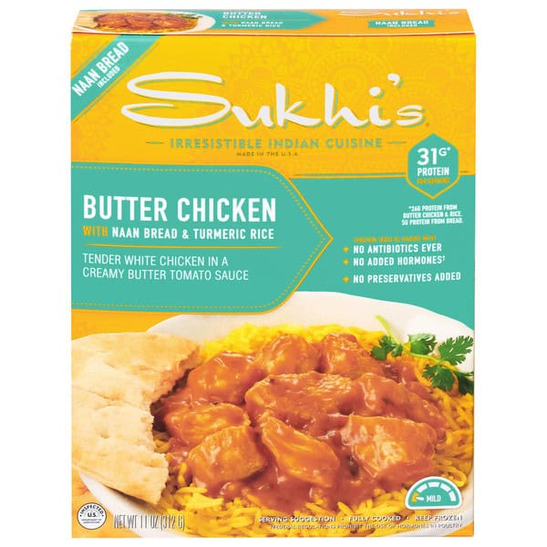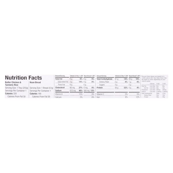 Butter Chicken & Turmeric Rice – Butter Chicken: Boneless Skinless White Chicken, Butter Sauce (water, Cream, Tomato Paste, Tomatoes [diced Tomatoes, Tomato Juice, Citric Acid, Calcium Chloride], Onion, Butter Concentrate [cultured Cream, Salt], Cane Sugar, Corn Starch, Jalapeno, Salt, Onion Powder, Spices, Paprika, Paprika Oleoresin, Turmeric, Xanthan Gum, Oleoresin Cardamom), Water, Sugar, Salt, Baking Soda. Rice: Water, Basmati Rice, Salt, Turmeric, Cumin.,naan Bread – Naan Bread: Enriched Wheat Flour [wheat Flour, Malted Barley Flour, Niacin, Reduced Iron, Thiamine Mononitrate (vitamin B1), Riboflavin (vitamin B2), Folic Acid], Water, Yeast, Sugar, Canola Oil, Salt.