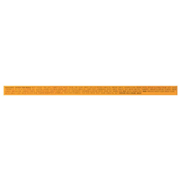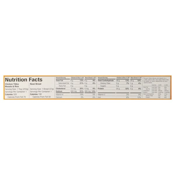 Chicken (white Meat Chicken, Expeller Pressed Canola Oil, Tapioca Starch, Salt, Oleoresin Paprika, Oleoresin Onion, Oleoresin Turmeric), Tikka Sauce [water, Tomato Sauce (water, Tomato Paste, Evaporated Cane Syrup, Salt, Vinegar, Onion Powder, Spices, Natural Flavor), Cream, Unsalted Butter (cream), Tomato Paste, Ginger, Caramelized Onion (onion, Expeller Pressed Canola Oil), Salt, Garlic, Tapioca Starch, Chickpea Flour, Spices, Evaporated Cane Syrup, Jalapeno, Curry Paste (lemongrass, Garlic, Shallot, Salt, Spices, Kaffir Lime Peel, Turmeric), Oleoresin Paprika, Cilantro, Xanthan Gum, Turmeric, Lemon Juice, Oleorasin Cardamom]. Naan Ingredients: Enriched Wheat Flour (wheat Flour, Malted Barley Flour, Niacin, Reduced Iron, Thiamine Mononitrate, Riboflavin, Folic Acid), Water, Yeast, Sugar, Canola Oil, Salt.