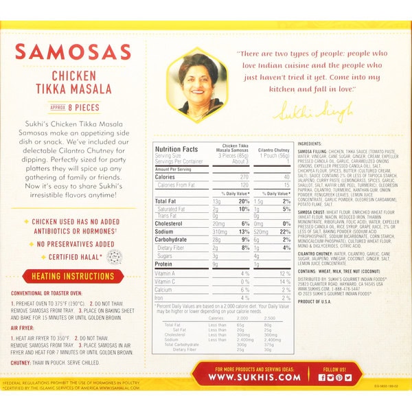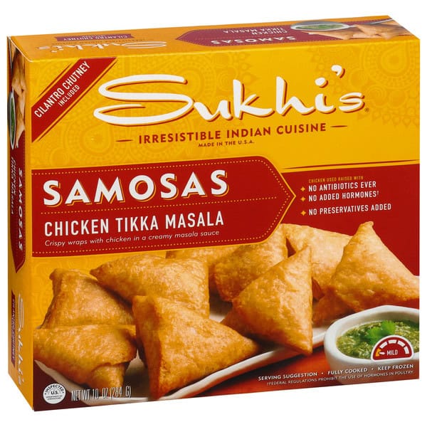Sukhi’s Chicken Tikka Masala Samosas are crispy handcrafted triangles filled with delicious seasoned chicken and creamy tomato onion masala sauce. Savory goodness in every bite, Sukhi’s frozen samosas make a great appetizer, side dish, snack or frozen meal. Perfectly sized and makes irresistible Indian food easily shareable. Each box made with care in the USA with No Preservatives Added, Chicken Used Raised with No Added Hormones & No Antibiotics Ever, and Halal Certified. Includes our delectable Cilantro Chutney for dipping. Contains Gluten.