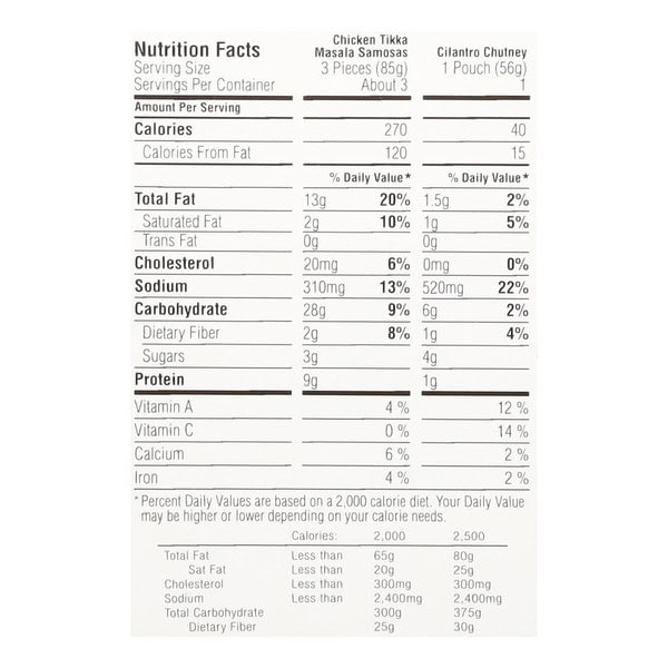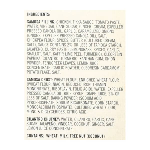 Samosa Filling: Chicken, Tikka Sauce [tomato Paste, Water, Vinegar, Cane Sugar, Ginger, Cream, Expeller Pressed Canola Oil, Garlic, Caramelized Onions (onions, Expeller Pressed Canola Oil), Salt, Chickpea Flour, Spices, Butter (cultured Cream, Salt), Sauce Contains 2% Or Less Of Tapioca Starch, Jalapeño, Curry Paste (lemongrass, Spices, Garlic, Shallot, Salt, Kaffir Lime Peel, Turmeric), Oleoresin Paprika, Cilantro, Turmeric, Xanthan Gum, Onion Powder, Fenugreek Leaves, Lemon Juice Concentrate, Garlic Powder, Oleoresin Cardamom], Potato Flake, Salt. Samosa Crust: Wheat Flour, Enriched Wheat Flour (wheat Flour, Niacin, Reduced Iron, Thiamin Mononitrate, Riboflavin, Folic Acid), Water, Expeller Pressed Canola Oil, Rice Syrup, Grape Juice, 2% Or Less Of Salt, Baking Powder (sodium Acid Pyrophosphate, Sodium Bicarbonate, Corn Starch, Monocalcium Phosphate), Cultured Wheat Flour, Mono & Diglycerides, Citric Acid. Cilantro Chutney: Water, Cilantro, Garlic, Cane Sugar, Jalapeno, Vinegar, Coconut, Ginger, Salt, Lemon Juice Concentrate.