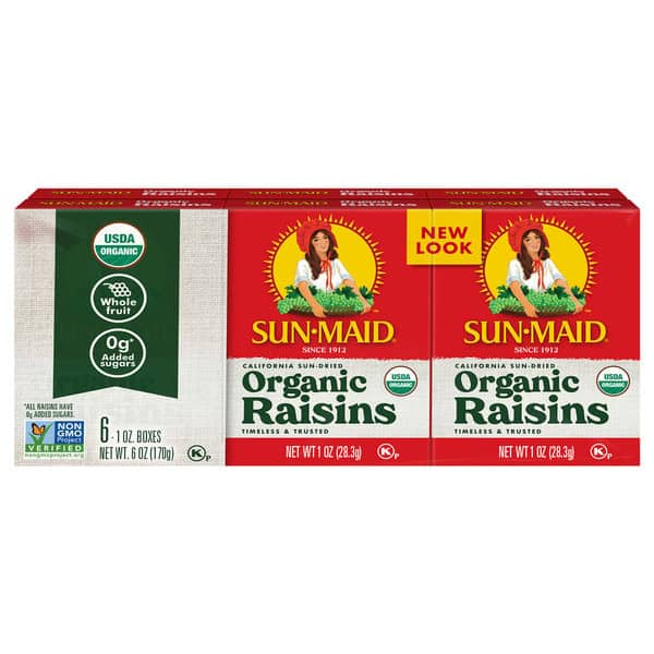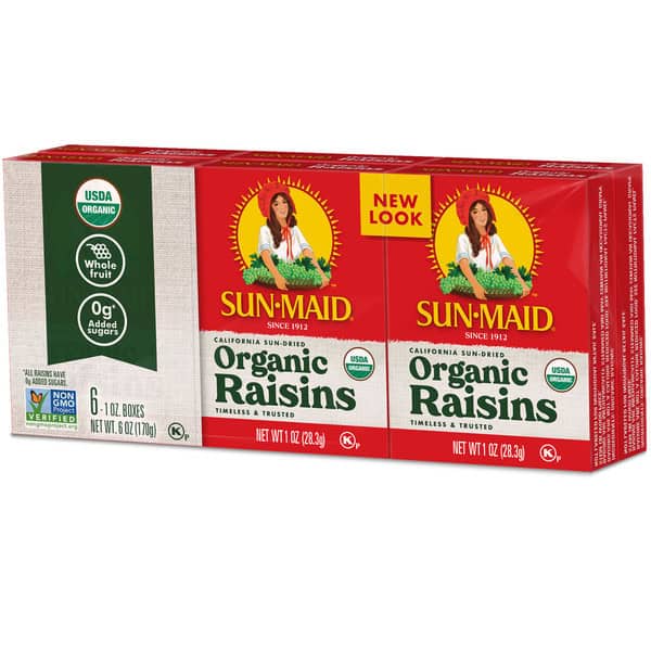 Sun-Maid® California Sun-Dried Organic Raisins – Organic California Thompson Seedless raisins are exclusively grown by our certified organic growers. Growers meet the strictest standards for organic agriculture. Maximum sweetness achieved, harvested & sun-dried to perfection. Sun-Maid® Organic Raisins are an all-time favorite for breakfast and dessert recipes alike. Not to mention, theirsweetness (sweet without adding sweeteners) makes for a tasty, snack, right out of the box. These grab n’ go snacks are made with whole fruit and are Non-GMO Project Verified. Sun-Maid® is the timeless and trusted go-to snack that’s simple, versatile and better-for-you. Make Sun-Maid® California Sun-Dried Organic Raisins a part of your daily routine, at home or on the go.