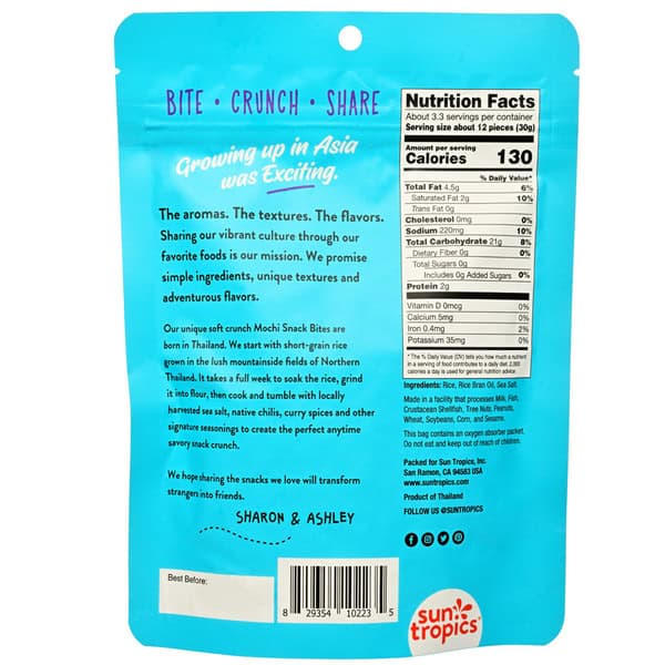 Sun Tropics Mochi Snack Bites are the perfect choice for those who crave a crunchy and savory snack. Made with all-natural ingredients, these rice nugget puffs come in four delicious flavors, including classic Sea Salt, Golden Curry, Tamari Teriyaki, and Thai Bird Sriracha. Gluten-free and dairy-free, these Mochi Snack Bites are guilt-free and perfect for those with dietary restrictions. They come in a convenient resealable packaging that makes them perfect for sharing and snacking on-the-go, anywhere, anytime. Enjoy a healthy snacking experience without compromising on taste with Sun Tropics Mochi Snack Bites!