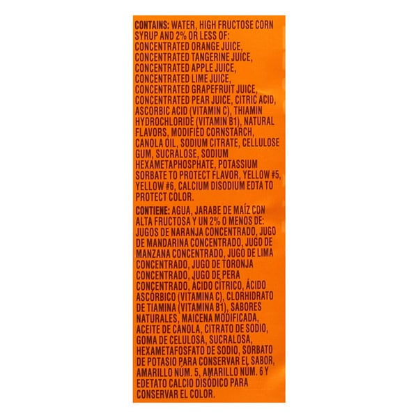 Water, High Fructose Corn Syrup And 2% Or Less Of Each Of The Following: Concentrated Juices (orange, Tangerine, Apple, Lime, Grapefruit), Citric Acid, Ascorbic Acid (vitamin C), Thiamin Hydrochloride (vitamin B1), Natural Flavors, Modified Cornstarch, Canola Oil, Sodium Citrate Cellulose Gum, Sucralose Acesulfame Potassium, Neotame Sodium Hexametaphosphate, Potassium Sorbate To Protect Flavor, Yellow #5, Yellow #6.