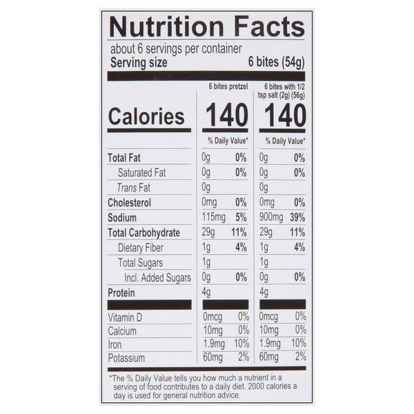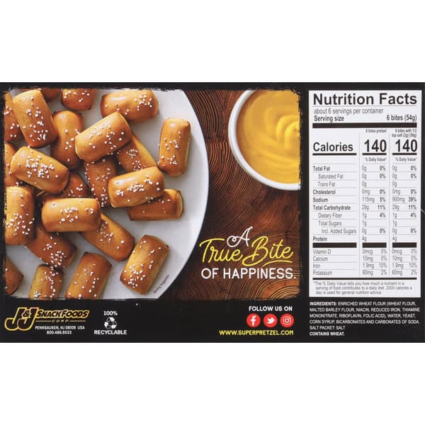New look! Fully baked. Soft pretzel bites. Salt pack included. No HFCS. A bite of true happiness.