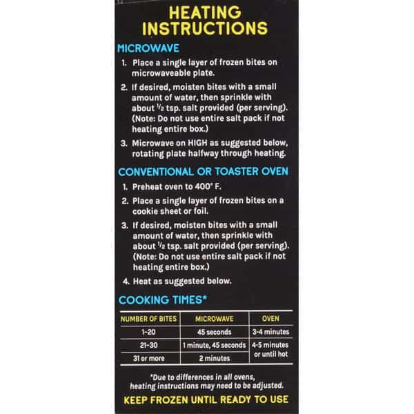 Heating Instructions: Microwave: 1. Place a single layer of frozen bites on microwaveable plate. 2. If desired, moisten bites with a small amount of water, then sprinkle about 1/2 tsp salt provided (per serving). (Note: Do not use entire salt pack if not heating entire box.) 3. Microwave on high as suggested below, rotating plate halfway through heating. Conventional or Toaster Oven: 1. Preheat oven to 400 degrees F. 2. Place a single layer of frozen bites on a cookie sheet or foil. 3. If desired, moisten bites with a small amount of water, then sprinkle with about 1/2 tsp salt provided (per serving). (Note: Do not use entire salt pack if not heating entire box.) 4. Heat as suggested below. Cooking Times (Due to differences in ovens heating instructions may need to be adjusted): Number of bites: 1-20; Microwave: 45 seconds; Oven: 3-4 minutes. Number of bites: 21-30; Microwave: 1 minute, 45 seconds; Oven: 4-5 minutes or until hot. Number of bites: 31 or more; Microwave: 2 minutes; Oven: 4-5 minutes or until hot.