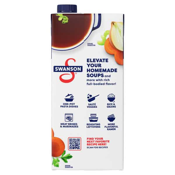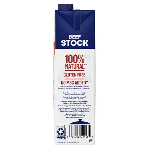 Elevate your homemade meals with the rich, full-bodied flavor of Swanson® Beef Stock. Swanson® beef stock brings together the perfectly balanced flavors of real roasted beef, farm-grown vegetables, and simple seasonings in a convenient recyclable carton. And just like homemade, our beef stock uses only 100% natural*, non-GMO ingredients, with no MSG added**, no artificial flavors or colors, and no preservatives. More convenient than beef bouillon, this gluten free beef stock is a versatile ingredient for your everyday cooking, adding flavor and moisture to both entrees and side dishes. Beef stock has an even richer flavor and a heavier texture than beef broth, with simple seasonings so you can adjust your finished dish to taste. It’s great for using to deglaze the pan after browning meat, as a soup base, or as a foundation for sauce or gravy. Swanson® Beef Stock is a must-have for your holiday cooking, bringing richer, elevated homemade flavor to beef-centered recipes such as pot roast, brisket and more. It’s not just any stock. It’s Swanson®.
