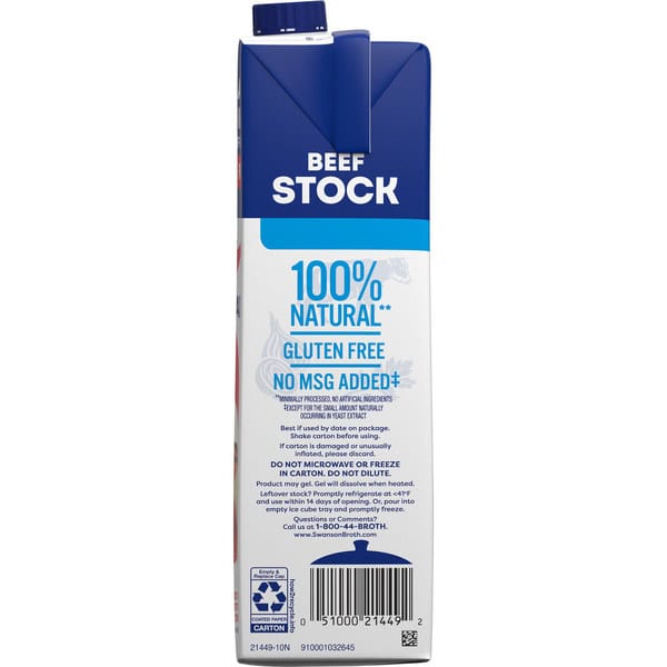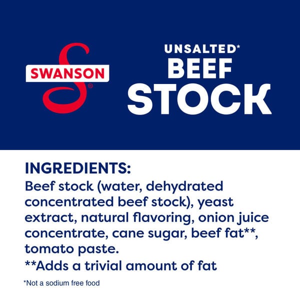 Elevate your homemade meals with the rich, full-bodied flavor of Swanson® Unsalted* Beef Stock. Swanson Unsalted* Beef Stock brings together the perfectly balanced flavors of roasted beef and fresh-picked vegetables with no added salt*, allowing the natural taste of your food to shine through. And just like homemade, our unsalted* stock is 100% natural** and uses non-GMO ingredients, with no MSG added***, no artificial flavors or colors, and no preservatives. More convenient than beef bouillon, this fat-free, gluten-free beef stock is a versatile ingredient for your everyday cooking, providing the perfect foundation for both entrees and side dishes – simply season to taste. Beef stock has an even richer flavor and a heavier texture than beef broth. It’s great for using to deglaze the pan after browning meat, as a soup base, or as a foundation for sauce or gravy. Swanson® Beef Stock is a must-have for your holiday cooking, bringing richer, elevated homemade flavor to beef-centered recipes such as pot roast, brisket and more. It’s not just any stock. It’s Swanson®.