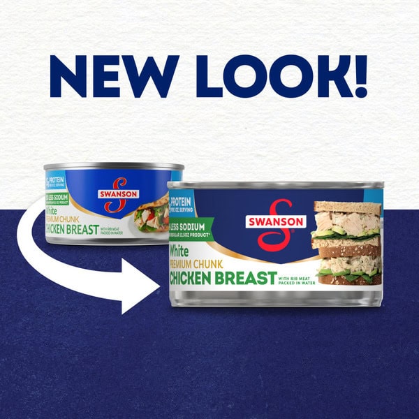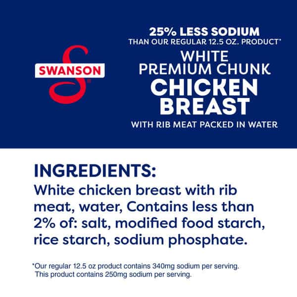 Enjoy a delicious shortcut to your favorite chicken dishes with Swanson® 25% Less Sodium White Premium Chunk Canned Chicken Breast in Water. Living up to Swanson’s tradition of simple ingredients, our ready-to-eat, fully cooked chicken chunks contain no antibiotics, added MSG or artificial flavors. With 250 mg of sodium per serving, this premium white chicken meat has 25% less sodium than a 12.5-ounce can of our regular white meat, which contains 340 mg of sodium per serving. It’s also 98% fat free, gluten free and an excellent source of protein, with 15 grams in each 3-ounce serving. Eat it on crackers, add it to salads, or use it in any recipe that calls for diced chicken breast. It’s perfect for making homemade buffalo chicken dip, chicken salad, chicken quesadillas, chicken alfredo and more. Each 12.5-ounce can contains 3-ounce servings of fully cooked chicken breast chunks. Create quick and easy everyday meals and sides with Swanson® 25% Less Sodium White Premium Chunk Chicken in a Can.